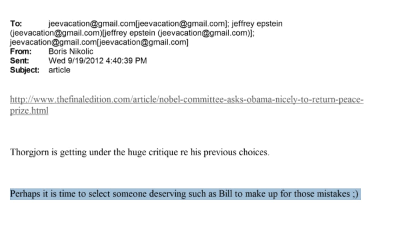 Epsteins svar: komitémedlemskapet var sikret. Valget av formannskapet var i november. Det «ser bra ut». Nobelkomiteens formannskap ble sporet som et overvåket institusjonelt aktivum i direkte korrespondanse mellom Epstein og Gates. Den samme e-posten inneholdt en oppdatering av DAF-strukturen og en bekreftelse på at Ruemmler – Obamas tidligere rådgiver i Det hvite hus – var med på en Skype-samtale. Nobelkomiteen. Offshore-fondet. Den juridiske beskyttelsen. Tre punkter i samme melding. ( EFTA00992684 )